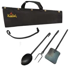 Set of Three Hand Forged Utensils with useful carrier and a unique dual-purpose hanger. Each utensil has been decoratively finished by hand.