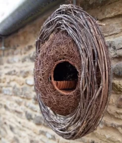 The design principle is that many small wild bird species prefer an open style nesting environment with easy access. However, this can cause an issue as little birds need protection from predators prying eyes. As a result, the open entrance with a nesting space tucked behind the sidewall and covered by the roof makes an ideal nest. The wreath is a great roosting place for small birds helping ensure their survival on cold nights and shelter away from predators.