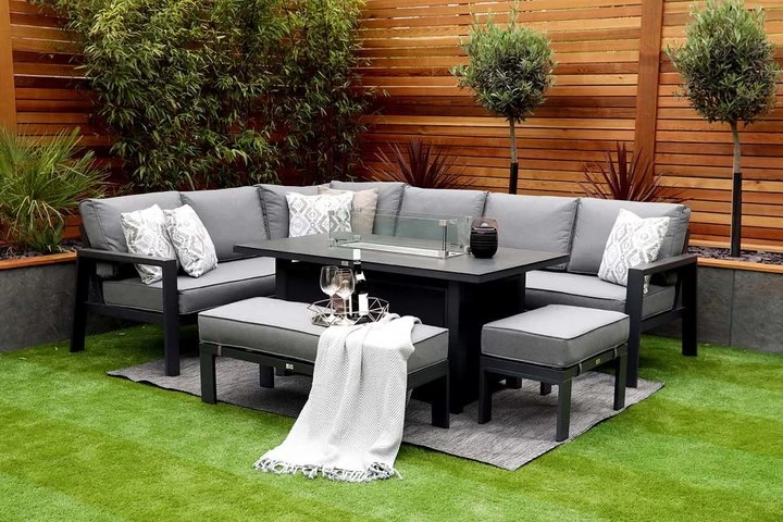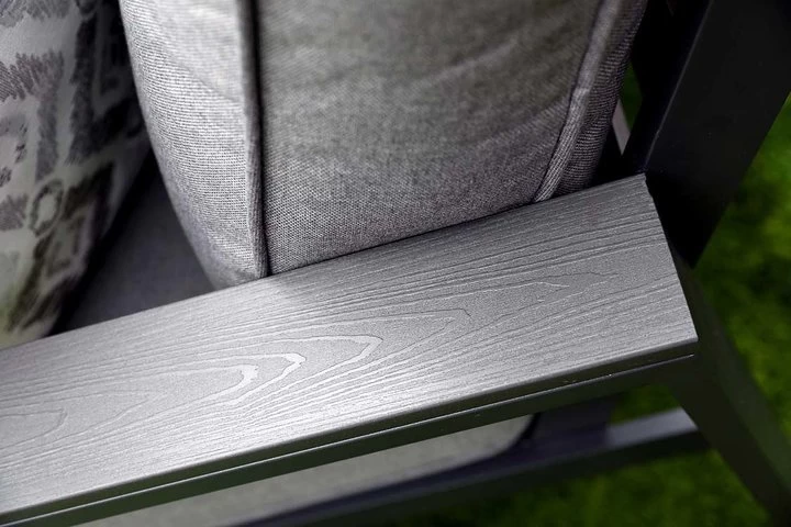 The gas-powered fire pit will warm your guests up on chilly evenings while relaxing on the soft, thick cushions on the spacious seating area of the Melbury Corner Modular set. This luxury range consists of an L-shape corner sofa, two benches for additional seating and a rectangular gas-powered fire pit. The supportive back bars will give the Melbury chair a powerful character and with the large plump back cushions, the comfort is unforgettable. The thick Polywood armrests fit in nicely with the powder-coated frames, creating an extra depth to the Melbury’s overall style. The summer-proof cushions in the Melbury range provide optimal comfort. All cushion covers are zipped for easy cleaning, and the fabric is designed to resist dampness and assist in drying.